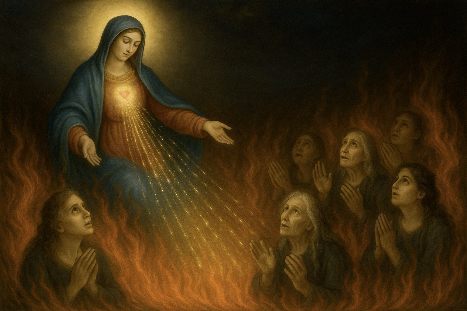 Comme je priais pour les âmes souffrantes, méditant ce qui m’avait été montré la veille, mon âme fut élevée dans la contemplation de la Mère de Dieu, qui ouvrait son Cœur Immaculé aux saintes âmes du Purgatoire. Je vis ce cœur maternel comme une porte d’or par laquelle de très nombreuses personnes passaient pour entrer dans le Cœur de Jésus, qui est le Ciel du Pur Amour. Elles étaient délivrées en ce jour de fête des peines qu’elles avaient dû subir jusque-là ; il me fut montré que d’une part les saints du Paradis leur lançaient des échelles de lumière qu’elles gravissaient pour s’élever au-dessus du lieu de purification, et que nous, ici-bas, nous les délestons par nos prières, nos suffrages et nos sacrifices, d’un poids qui les empêcherait de monter à ces échelles pour rejoindre la félicité des Élus. Puis je vis la très Sainte Vierge présenter à son divin Fils toutes les âmes délivrées en ce jour, leur murmurant à l’oreille, ou plutôt dans le cœur : « Faites tout ce qu’Il vous dira ! »